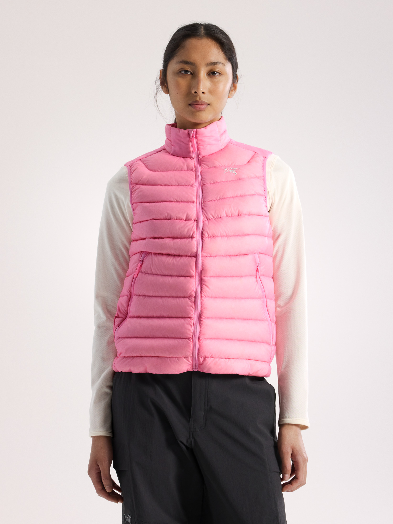 The Arc’teryx Cerium Down Vest (Women’s) is a lightweight, insulated layer engineered to provide core warmth with minimal bulk and excellent packability. Deploying a blend of 850-fill-power goose down and strategically placed Coreloft™ synthetic insulation, the vest balances high thermal efficiency with moisture-tolerant performance in key areas (such as shoulders and upper back), helping it better maintain loft and warmth in damp or changing conditions compared with down-only pieces. This hybrid insulation strategy makes the vest a strong choice for cool-weather backpacking, alpine travel, roadside adventures, and everyday outdoor use in cooler climates. Constructed from a lightweight Arato™ nylon fabric with a durable water-repellent (DWR) finish, the Cerium Down Vest sheds light moisture and resists wind while keeping weight low. Its sleeveless design focuses insulation on the core — the most critical area for maintaining body heat — while allowing unrestricted movement of the arms. This makes it particularly adaptable as a standalone midlayer on chilly, dry days or as part of a layered system under a shell or softshell in more unsettled weather. The women’s-specific cut features subtle tailoring through the waist and hips for a more ergonomic silhouette, ensuring comfort during extended wear and layering. Slanted hand pockets offer secure storage and additional warmth for hands when temperatures drop, and the full-length zipper allows for quick temperature regulation on the move. Overall, the Cerium Down Vest merges versatile warmth with lightweight performance, aimed at users who prioritize core insulation without unnecessary bulk.