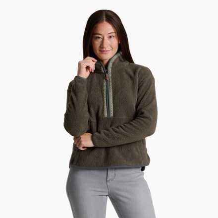 Heritage accent trim completes the mountain aesthetic of the women's KUHL Hygge Half-Zip pullover while its melange sherpa fleece and relaxed fit make it a go-to for cozy nights at the cabin.