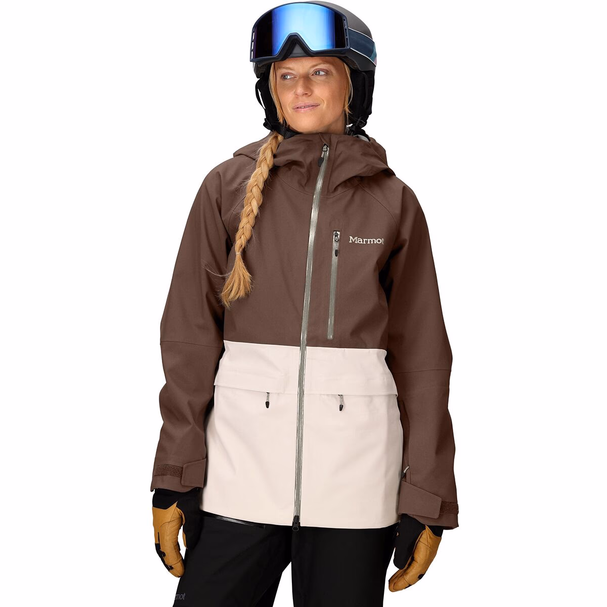 The Marmot Refuge Pro Jacket (Women’s) is a technical waterproof shell engineered for backcountry and resort ski use, offering robust protection against snow, wind, and wet winter weather. It uses Marmot’s 3-layer NanoPro™ waterproof/breathable membrane, which helps keep moisture out while allowing internal vapor to escape, balancing weather resistance and comfort during both high-intensity climbs and cold descents. Fully taped seams and waterproof pocket zippers provide complete leakproof confidence on stormy days, and the helmet-compatible adjustable hood helps block snow and wind when you’re wearing protective headgear. Oversnow features like a fixed powder skirt help keep snow out of your layers, making this jacket suitable for deep powder skiing and variable winter conditions. Underarm PitZips provide ventilation when activity levels rise, helping regulate internal heat and moisture on skin tracks, steep approaches, or transitions. Strategic pocket placement, including secure waterproof hand pockets and internal storage, supports organization of essentials on long days in the mountains. Finished with adjustable cuffs and a drawcord hem that help seal out cold air, the Refuge Pro Jacket’s blend of weather protection, mobility, and durable construction positions it as a versatile choice for alpine skiing, snowboarding, and other cold-weather pursuits where a waterproof shell is essential.