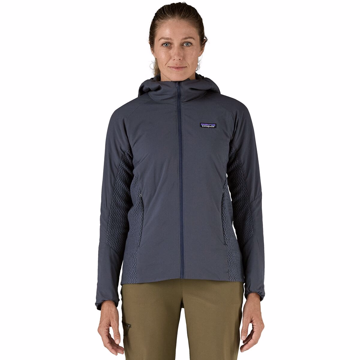 The Patagonia Women’s Nano-Air Light Hybrid Hoody is an active-insulation jacket designed for high-output mountain activities where balancing warmth and breathability is essential. Built as a hybrid layer, it combines lightweight synthetic insulation in key areas with highly breathable stretch panels to regulate body temperature during sustained movement. The front panels and hood use 40-gram FullRange® synthetic insulation, which provides light warmth while remaining flexible and air-permeable. FullRange insulation is designed to stretch and breathe during activity, helping reduce the need to remove layers when moving quickly in cool conditions. This insulated section works together with a lightweight recycled polyester ripstop shell that offers moderate wind resistance and mobility. To improve ventilation, the jacket incorporates R1® Air fleece panels across the back, sides, and underarms. These areas allow excess heat and moisture to escape while maintaining stretch and comfort during climbing, ski touring, or hiking. This hybrid construction allows the jacket to provide insulation where it’s most useful while maximizing breathability in high-heat zones. The hoody features a streamlined, ergonomic fit that layers comfortably under a shell or can be worn as an outer layer in mild conditions. Lightweight materials and stretch construction allow the garment to move naturally with the body during dynamic movement. Overall, the Nano-Air Light Hybrid Hoody is intended for aerobic cold-weather pursuits where consistent temperature regulation and mobility are priorities.