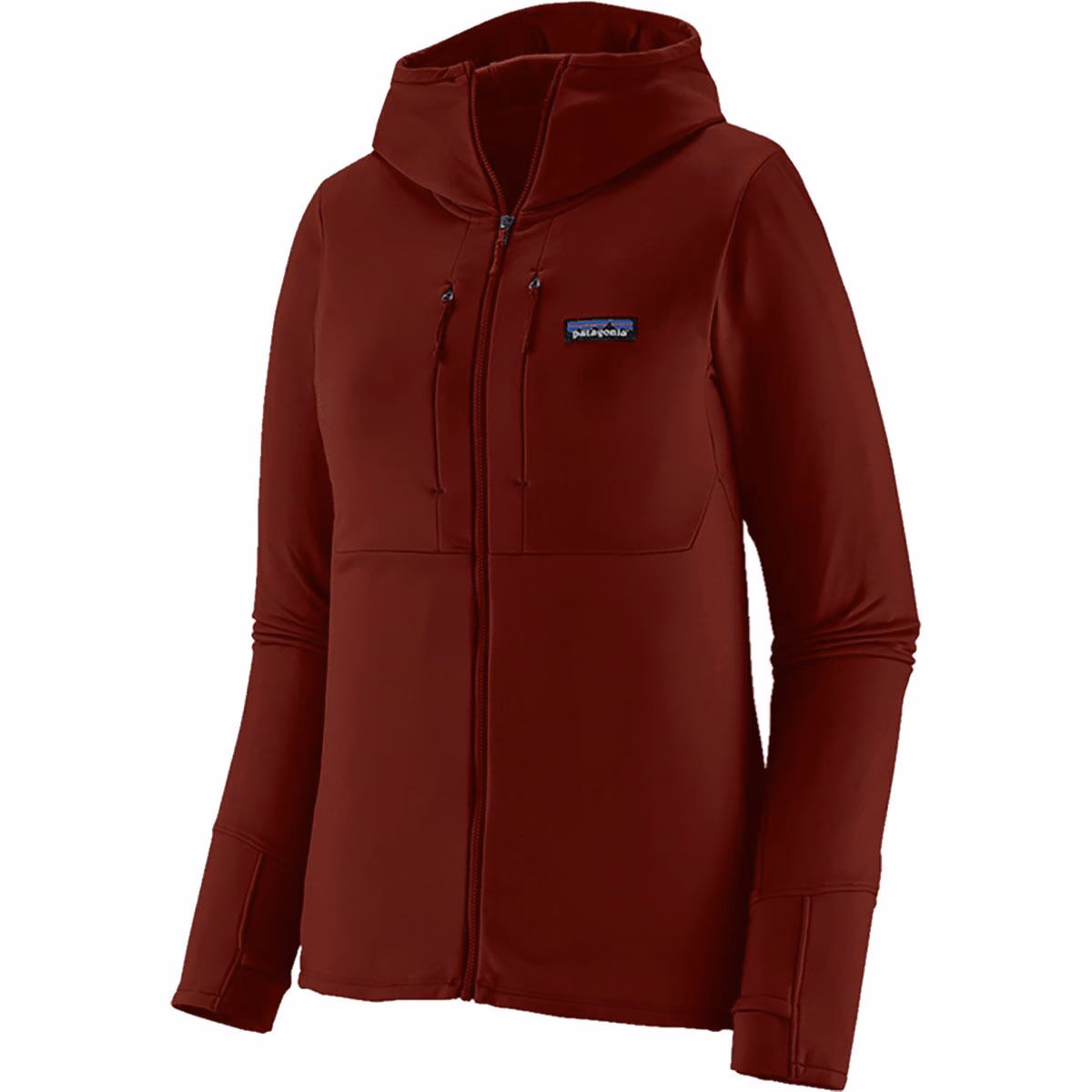 The Patagonia Women’s R1 Thermal Hoody is a technical fleece midlayer designed for cold-weather mountain environments where warmth, breathability, and mobility are equally important. Part of Patagonia’s R1 series, the hoody is intended for high-output alpine activities such as climbing, ski touring, mountaineering, and winter hiking. The garment is built from Technostretch fleece composed of 91% recycled polyester and 9% elastane, a fabric that combines durability with significant stretch. The outer surface is smooth and abrasion-resistant, helping deflect light wind and snow, while the interior features a micro-grid fleece structure designed to trap warmth and efficiently wick moisture during sustained activity. This construction allows the hoody to provide insulation without retaining excess heat. The hoody design adds versatility in alpine conditions. A close-fitting hood provides additional warmth and can fit comfortably beneath a helmet when climbing or skiing. The stretch fabric and articulated patterning allow unrestricted movement during technical activities, while the streamlined fit layers easily beneath shell jackets. Low-profile cuffs and flat seams help minimize bulk under outer layers. The jacket also includes practical storage with a zippered chest pocket for small essentials. With a lightweight design and breathable insulation, the Women’s R1 Thermal Hoody functions as a reliable midlayer for cold-weather movement in the mountains while remaining compact enough for layering systems that require adaptability.