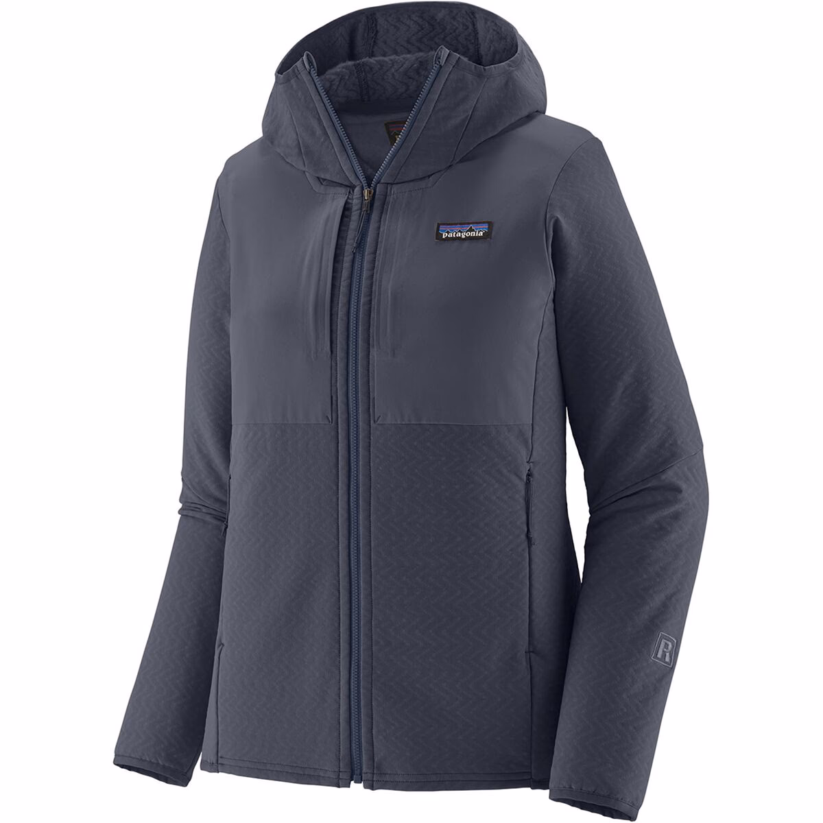 The Patagonia Women’s R2 CrossStrata Hoody is a hybrid midlayer designed for cold-weather mountain activities that require a balance of insulation, breathability, and weather resistance. Positioned within Patagonia’s R-series lineup, the hoody combines the warmth of fleece with the durability and protection of a softshell-like exterior, making it suitable for activities such as alpine climbing, ski touring, mountaineering, and winter hiking. The garment is constructed from Patagonia’s R2 CrossStrata double-weave fabric, made primarily from recycled polyester with elastane for stretch. The outer face is smooth and tightly woven to improve abrasion resistance and block wind more effectively than traditional fleece. Inside, a zigzag grid fleece structure traps warmth and promotes moisture transfer during high-output activity, helping maintain thermal balance during sustained movement. This hybrid construction allows the hoody to function as a breathable outer layer in cool, dry conditions while still performing effectively as a midlayer under a shell in colder or wetter weather. The stretch fabric and articulated patterning allow unrestricted movement during technical climbing or skiing, and the durable exterior helps resist wear from rock, gear, or backpack straps. The hoody includes a helmet-compatible hood that provides additional protection in exposed environments while maintaining a close fit. Additional details include a full-length front zipper for adjustable ventilation and zippered hand pockets positioned to remain accessible when wearing a harness or backpack waistbelt. Overall, the R2 CrossStrata Hoody is designed for cold-weather mountain use where warmth, breathability, and durability are required within a single layer.