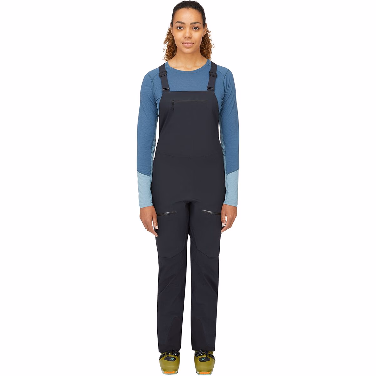 The Rab Khroma Kinetic Bib (Women’s) is a technical waterproof shell bib designed for ski touring, mountaineering, and alpine backcountry use. It’s engineered around Rab’s Proflex™ three-layer stretch-woven fabric, which blends the protective traits of a traditional hardshell with the comfort, stretch, and mobility of a softshell — a combination that supports dynamic movement on steep ascents and descents without sacrificing weather resistance. This bib is cut for mountain skiing and expedition use, with articulated knees and a stretchy lower back panel that promote a full range of motion on kick turns, traverses, and bootpacks. The high bib suspender structure helps keep snow out while also providing space for layering without bulk, and the regular fit accommodates insulated base layers and midlayers beneath for colder conditions. Rab integrates practical details that enhance comfort and functionality during extended outings. Large zippered thigh vents help release heat efficiently during uphill climbs, while multiple ski-specific pockets — including thigh and rear pockets and a high bib pocket — give riders secure storage for small essentials and tools on the go. A drop-seat feature adds convenience for quick breaks without removing the bib. Durability and field-ready design are evident in features such as reinforced cuffs and internal gaiters that seal out snow and protect against abrasion from boots and crampons. The Proflex™ material’s breathable membrane and PFC-free durable water repellent finish help manage moisture and weather on long spring missions and changing alpine conditions. Overall, the Women’s Rab Khroma Kinetic Bib balances weather protection, stretch, and breathability for ski tourers and mountaineers who demand mobility and shelter from wet, windy mountain conditions without excess bulk.